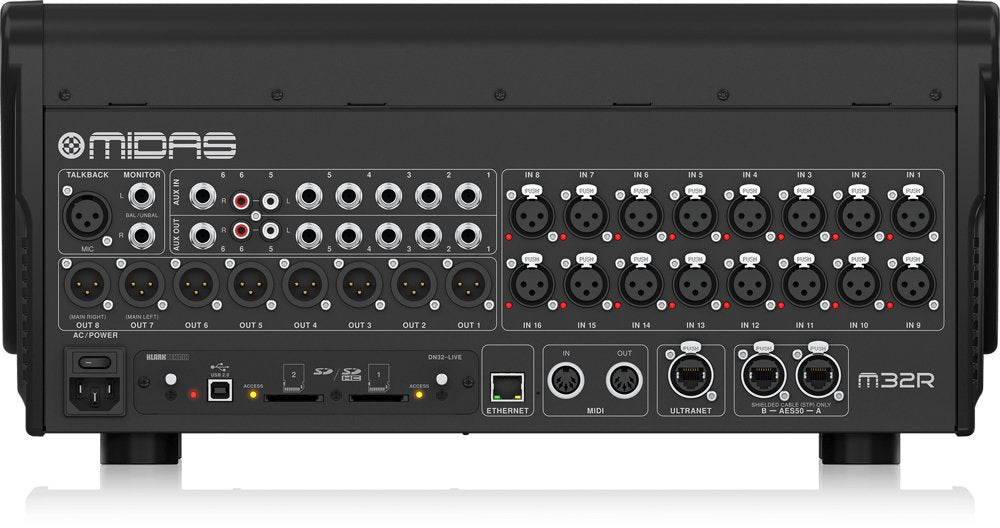 Whether you're mixing a concert, recording in the studio, or handling broadcast projects, the M32R LIVE's robust feature set"such as built-in effects, customizable routing, and network capabilities"allows for precision and flexibility. Its compact size doesn't compromise functionality, offering AES50 networking for seamless integration with additional I/O boxes and other equipment. The M32R LIVE embodies Midas' commitment to innovation and quality, empowering audio professionals to achieve unparalleled results.