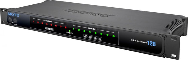 Built from the same technology found in MOTU's flagship MIDI Timepiece, the MIDI Express 128 is a professional MIDI interface that provides plug-and-play connectivity to any USB-equipped Mac or Windows computer. The Express 128 provides 8 MIDI IN, 9 MIDI OUT, 128 MIDI channels and compatibility with all Macintosh and Windows software.