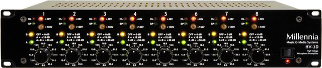 The Millennia HV-3D (tm) is a height channel, fully matched microphone preamplifier of uncompromising sonic character, technical specification, and mechanical workmanship. The HV-3D offers multiple channels of HV-3C preamplifiers at significantly less per-channel cost.