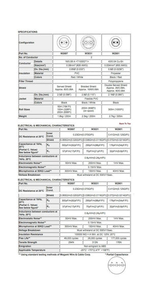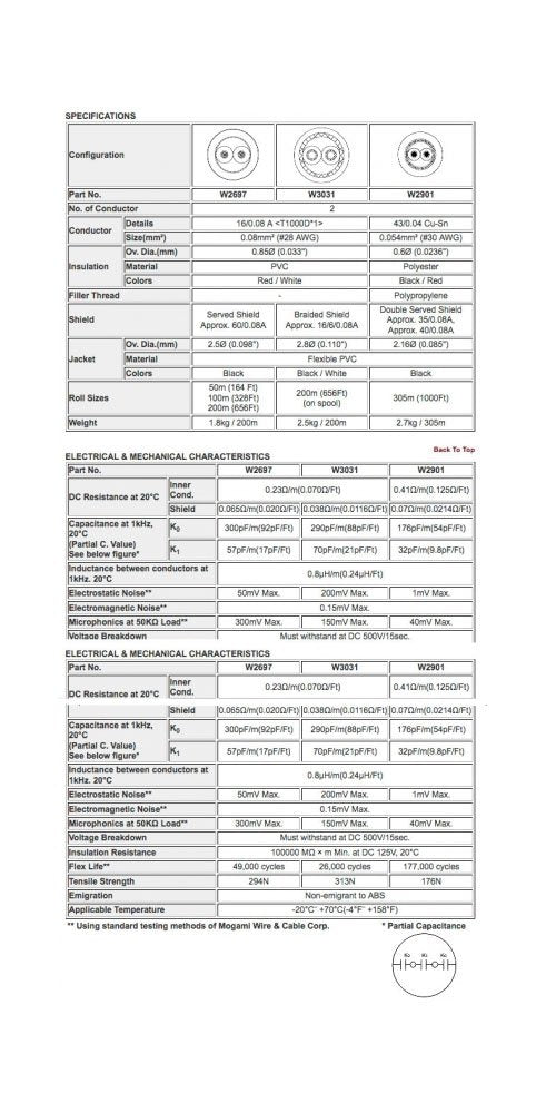 These miniature microphone cables feature necessary mechanical strength (tensile strength and long flex life) and flexibility for lavalier microphones and other applications. All balanced configuration. Part No. W3031 cable is exactly same construction as Part No. W2697 cable except for shield structure. Part No. W2697 cable is constructed with served (spiral) shield, while Part No. W3031 cable is constructed with braided shield. Part No. W2901 is specially designed with better tensile strength and longer flex life, sacrificing some sound quality, and creating a slightly more difficult soldering job because of used copper-tin alloy conductor, this cable is mechanically very strong and durable.