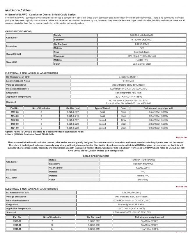0.15mm² (#26AWG ) conductor overall shield cable series is comprised of about two times larger conductor size as mechatro overall shield cable series. There is no community in design policy, as they were originally custom-made cables and remained as standard items one by one, however, they are suitable where larger conductor size, flexibility and compactness are all required. Available from five up to nine conductor, not in twisted pair configuration.