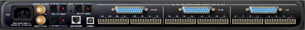 The 24Ao offers twenty-four analog outputs. Both units include three 8-channel ADAT optical banks, for a total of 72 channels each (24 analog plus 48 optical). Use the 24Ai and 24Ao to add analog I/O to your computer, or as a flexible optical expander and mixer. Or both!