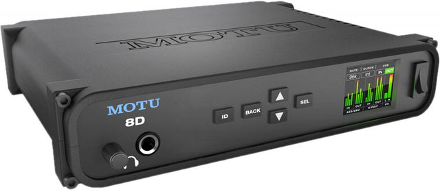 Housed in a compact, aluminum alloy enclosure you can take anywhere, the 8D is equally well-suited for studio, stage or industrial applications, with or without a computer. As an interface, router, converter or stand-alone mixer, the 8D provides eight separate digital audio input and output channels, 32 channels of audio networking, 64 channels of USB audio I/O and stereo headphone output for a total of 210 simultaneous I/O channels.