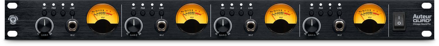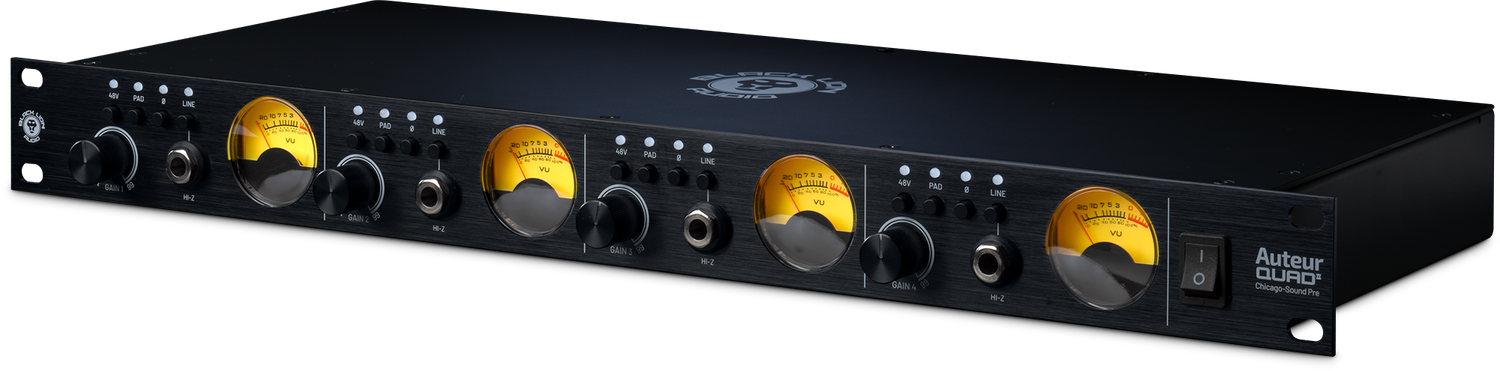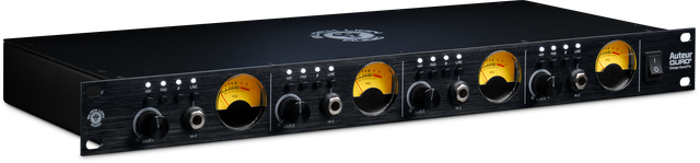 Each of the four channels includes front-facing DI inputs for instruments, rear-panel XLR inputs, and both XLR and TRS output options. This gives engineers flexibility for a variety of recording setups. The unit offers independent phantom power, polarity reverse, and a -10 dB pad on every channel. This updated model also includes improved analog VU meters and increased gain, with up to 66 dB available to support low-output microphones like ribbons and dynamics. Whether you're aiming for clean and accurate tones or a more colorful, analog feel, the Auteur Quad2 delivers a well-balanced and musical response that fits seamlessly into any studio environment.