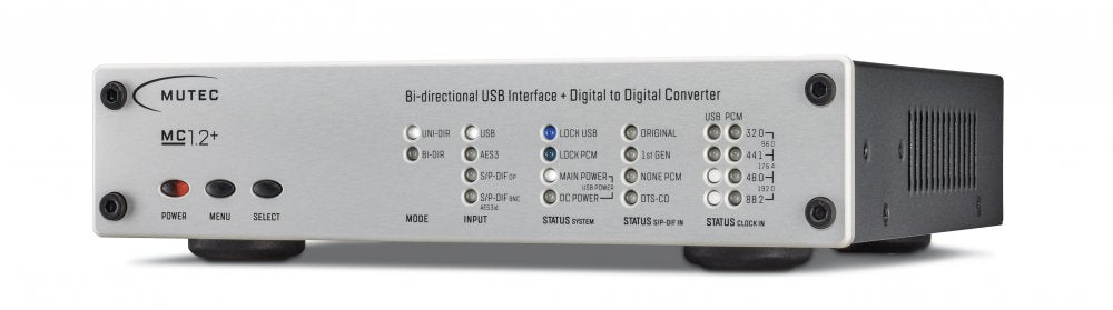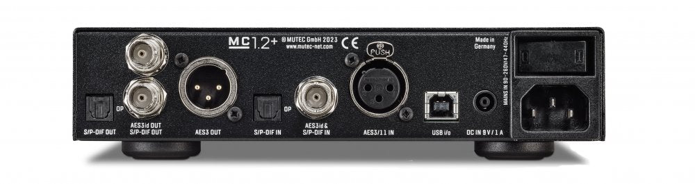 The MC1.2+ easily converts PCM audiostreams through its USB, AES/EBU (XLR), AES3/EBUid (BNC) and S/P'DIF (Toslink/BNC, RCA via adapter) interface ports. This process can be performed simultaneously - also via USB - in both directions: In and Out. Such an exceptional flexibility proves to be extremely useful in a professional recording studio, broadcast studio or as part of a sound reinforcement system. There, thanks to the MC1.2+, versatile and lossless signal transfers between audio interfaces, digital mixers and effects processors in real'time become possible. In addition, this DDC from MUTEC improves the sound quality of the USB connection by isolating the USB power supply and then regenerating the signal. This feature makes the MC1.2+ also very appealing for audiophile listeners.