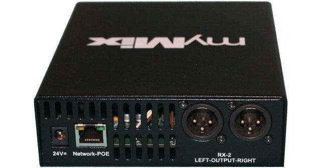 Constructed with a solid metal housing, the RX-2 ensures durability for both studio and live environments. It features two balanced line-level XLR outputs, delivering high-quality, low-latency audio over IP through standard CAT5 cabling. The myMix network can handle up to 500 audio channels, allowing for extensive scalability. The RX-2 is particularly useful for routing mixes created on myMix devices to different locations, such as sending a musician's on-stage stereo mix to a wireless in-ear monitor system, with the option to incorporate additional channels like talkback or intercom.