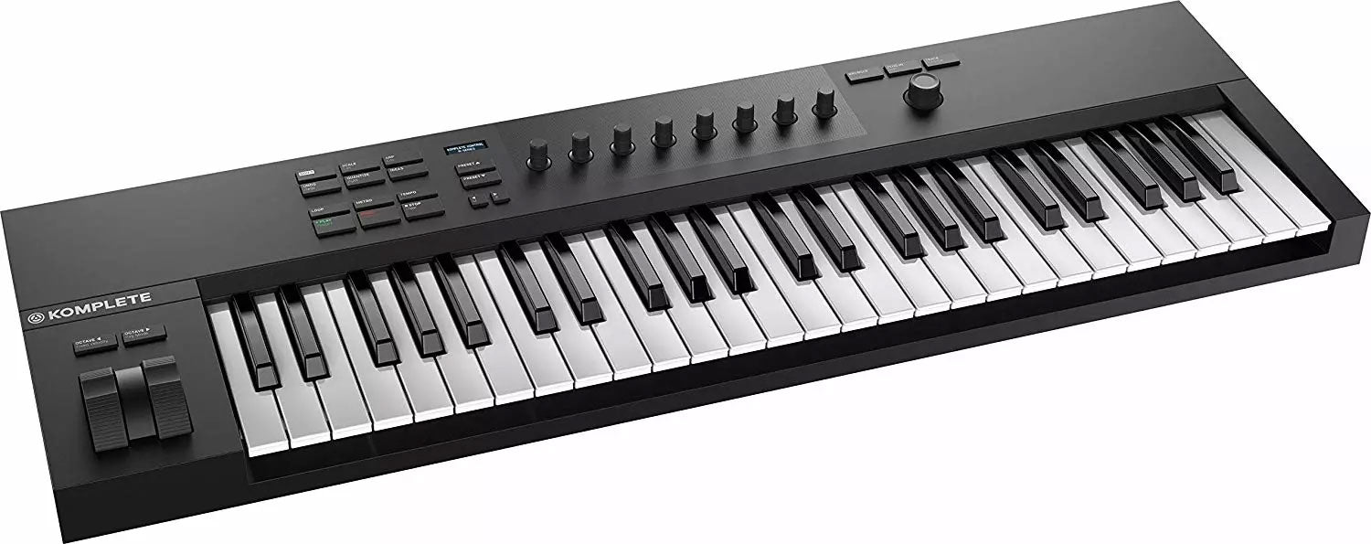 The KOMPLETE KONTROL A49 is a smart, streamlined MIDI keyboard controller that blends hands-on control with deep software integration for an effortless music-making experience. Featuring 49 semi-weighted custom keys from Native Instruments, the A49 delivers a natural, expressive feel that’s perfect for composing, performing, and sound design. Its intuitive layout includes an OLED display, eight touch-sensitive control knobs, and a four-directional push encoder, allowing you to browse, load, and tweak your instruments and effects without ever leaving the keyboard.