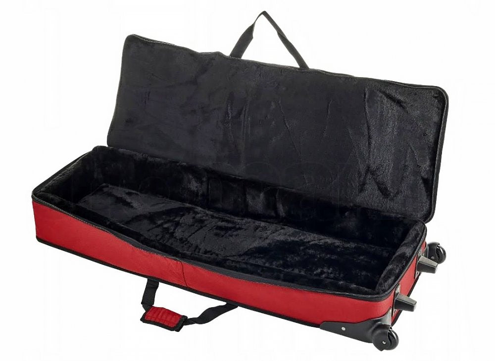 Padded soft case with wheels for easy transport. Large-sized pocket for cables, stand and pedals. Alternate carrying handle on side.