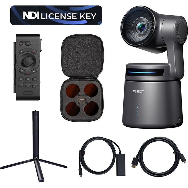 This kit includes a Tail Air PTZ camera with 4x Zoom along with a smart remote, NDI license key, USB-C to Ethernet adapters, Micro-HDMI to HDMI cables and an extendable tripod.