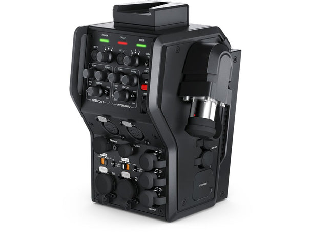 Blackmagic Camera Fiber Converter The Blackmagic Camera Fiber Converter attaches to the back of your URSA Mini or URSA Broadcast camera. In addition to converting all of the audio, video, camera control and talkback into fiber, it also adds professional studio camera controls to the back of your camera. You get control for return feeds, dual intercom controls with the ability to mix in program audio, record, focus and iris controls, headset connectors, audio and more. The camera converter also includes a VLock mount plate on the top for attaching accessories such as a professional Blackmagic Studio Viewfinder. The Blackmagic Camera Fiber Converter has connections for your Ultra HD camera feed, 3 HD return feeds, full remote camera control, PTZ, multiple channels of talkback, tally and more!