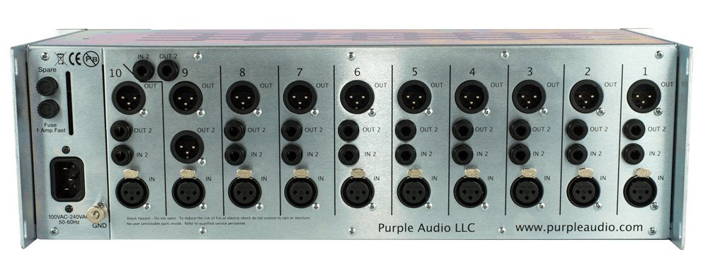 Many manufacturers, including past Purple Audio prototypes, use linear power supplies for their racks. Traditional wisdom holds that linear power supplies are ideal for audio and generate less noise and interference. However, in the case of a 10 slot series 500 rack, even a well designed linear power supply generates a substantial magnetic hum field and far too much heat to allow for internal mounting. This problem is caused in part by the wide variation of line voltage across the world.