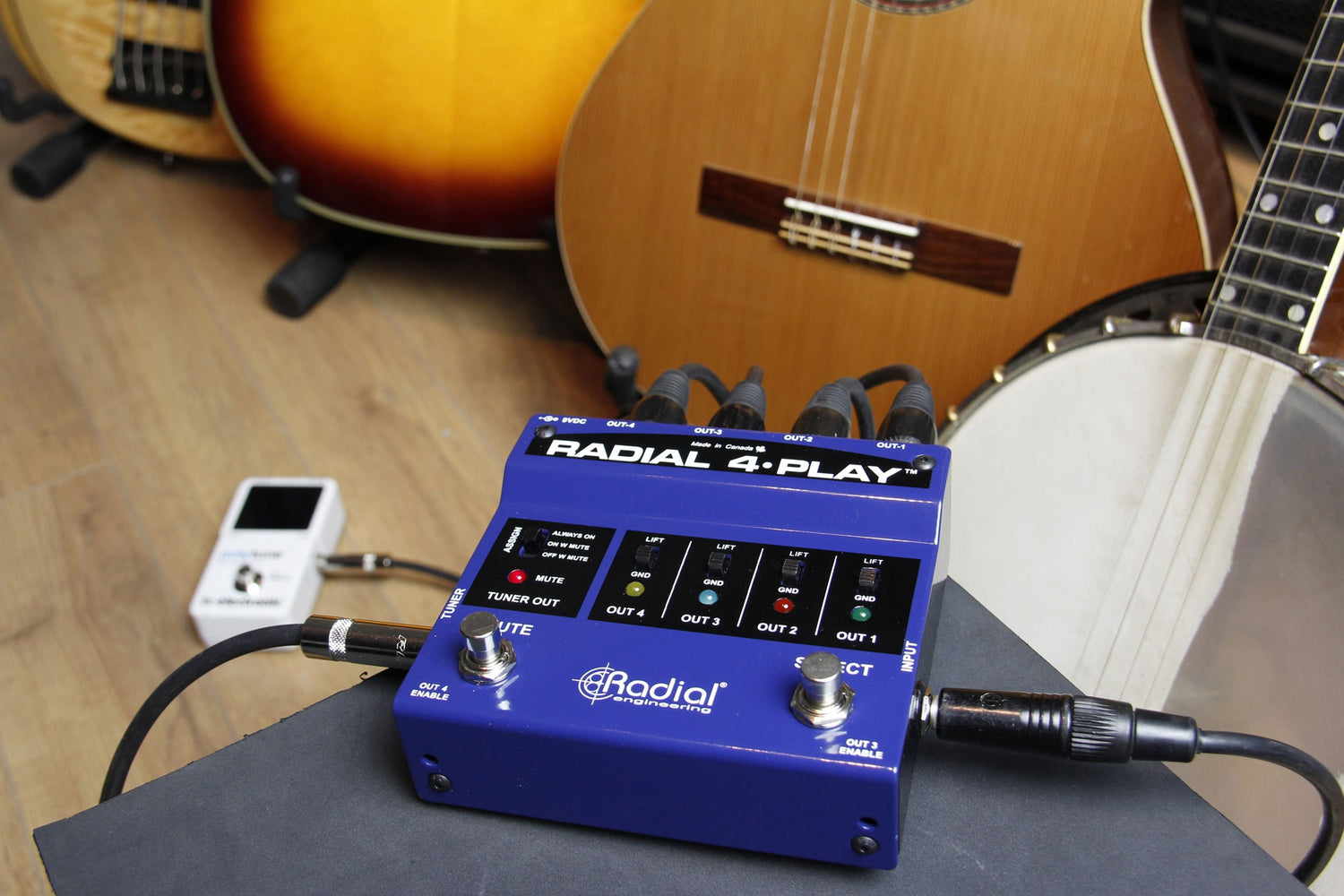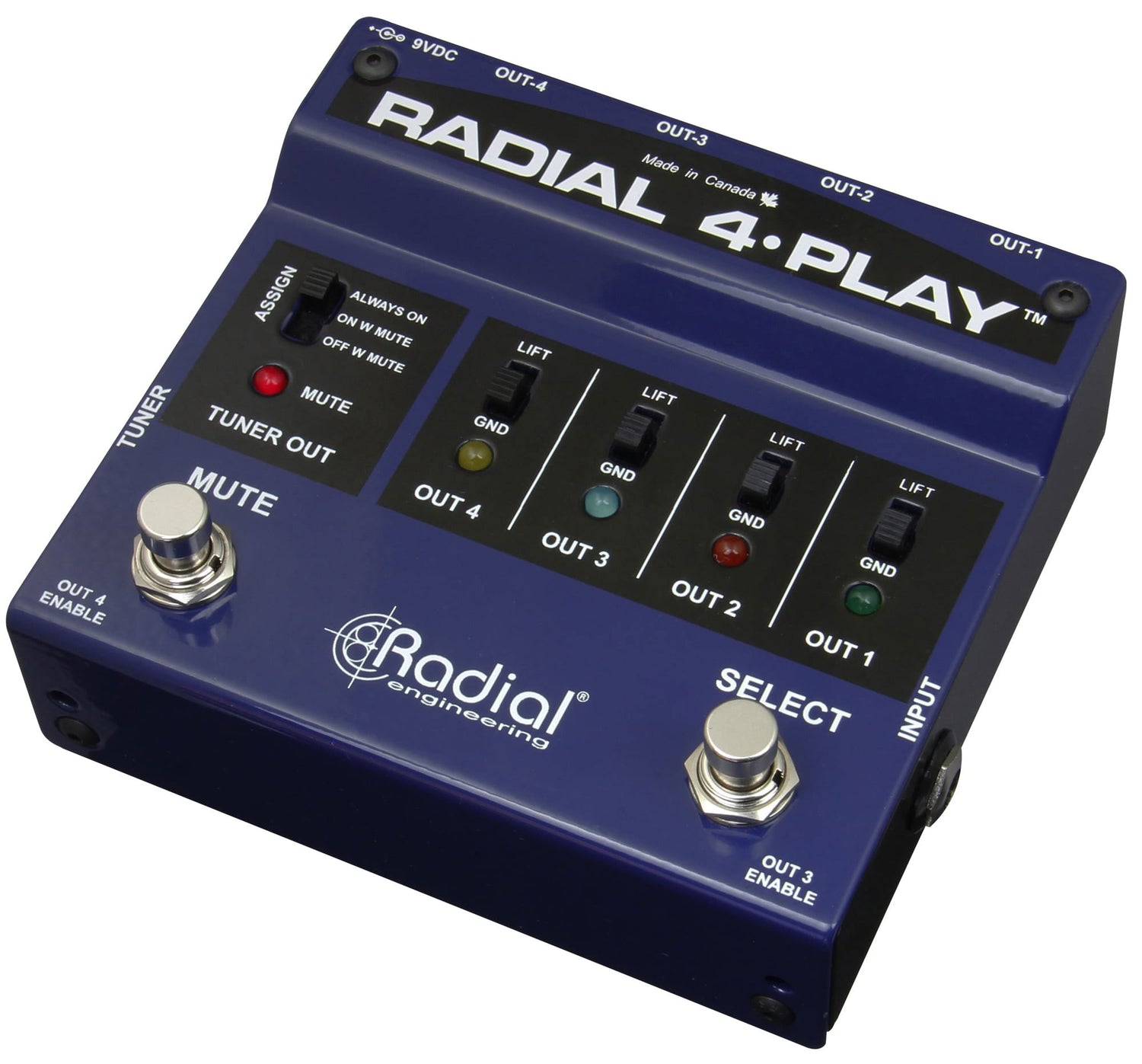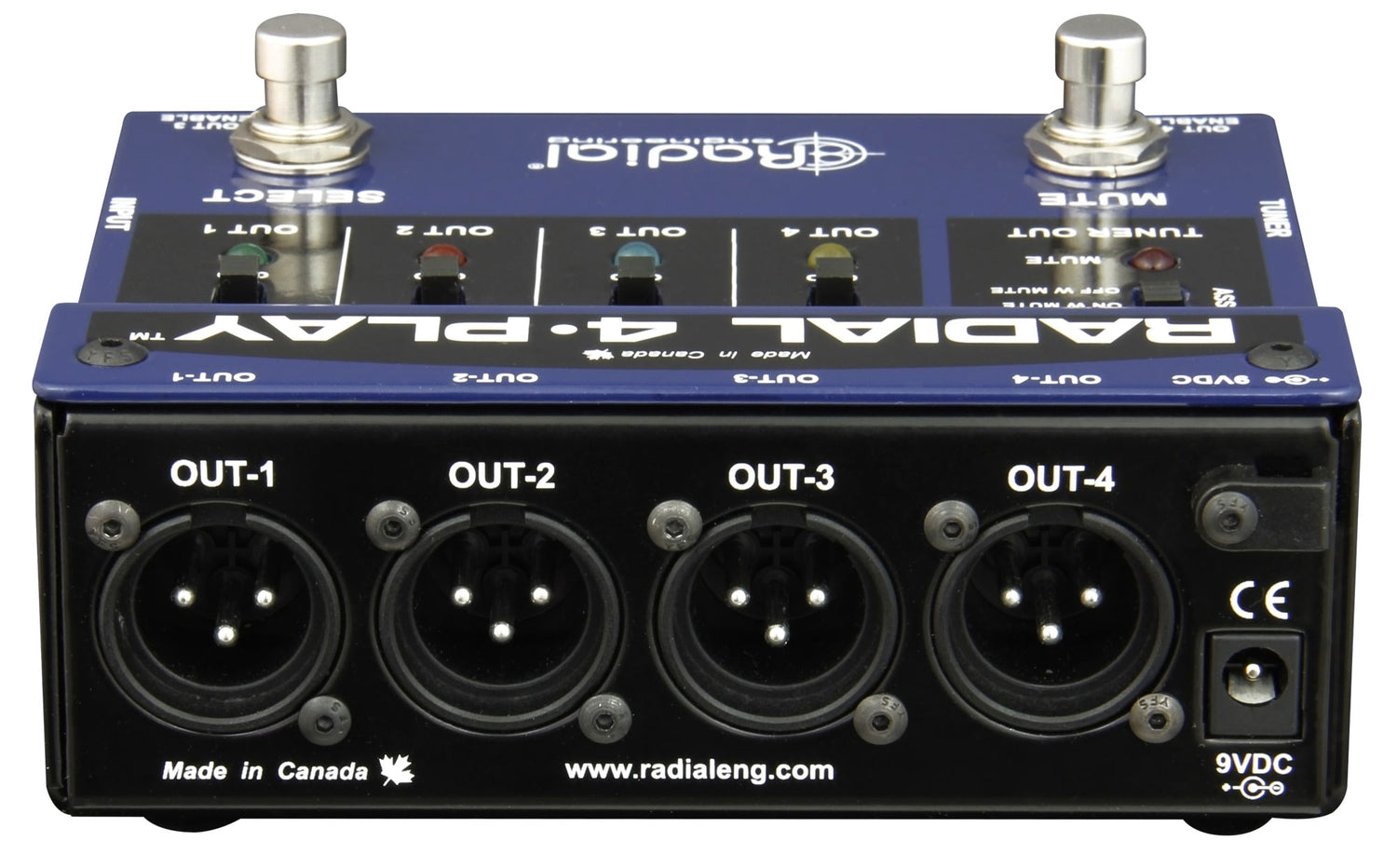 The Radial 4-Play is a multi-output active DI box built specifically for multi-instrumentalists who need a fast, clean way to switch between instruments on stage. With four individually selectable balanced XLR outputs, it lets each instrument feed its own dedicated channel in the PA system which is ideal for optimizing tone, EQ, and effects for every instrument without interrupting the performance.