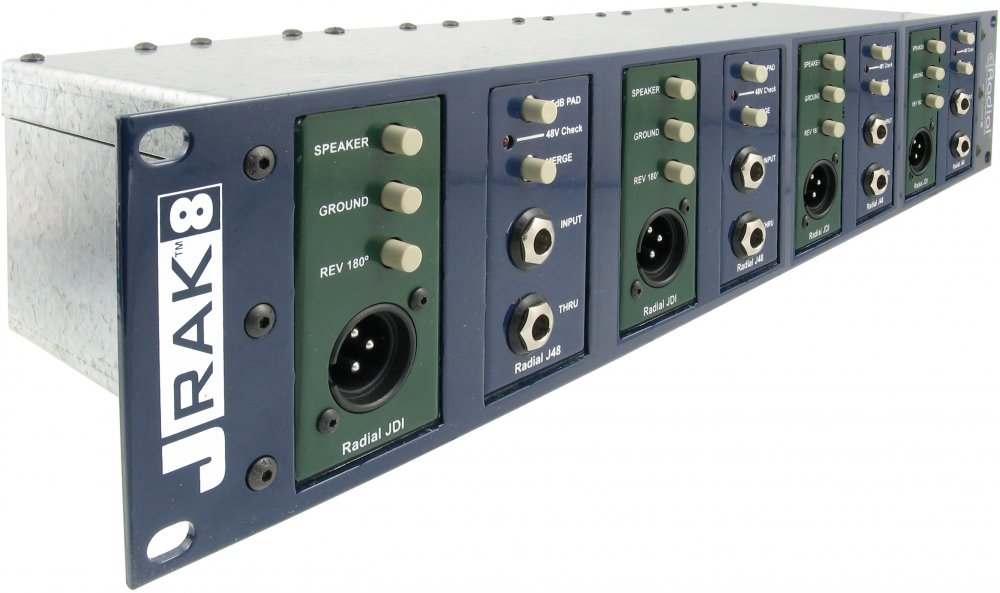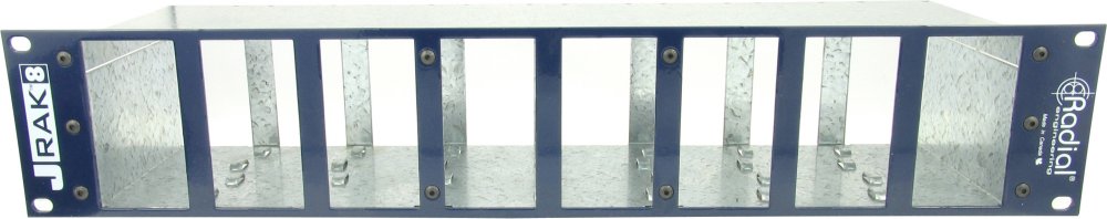 Most Radial direct boxes, splitters, isolators and Reampers may be rack-mounted using either the J-Rak 4 or the J-Rak 8. These enable multiple units to be combined and safely stored for touring or used as part of a permanent installation. Mounting the DIs is easy. You simply remove the outer shell and slide the inner frame into one of the racks.