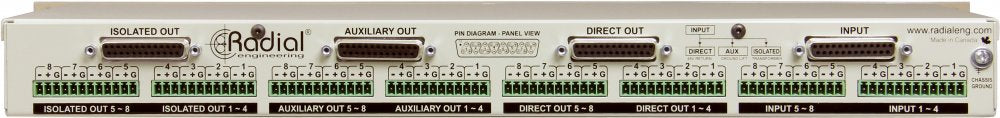 All of the eight incoming signals are routed to the direct output, the transformer isolated output and an auxiliary out, enabling multiple signal paths to be put into practice without the usual noise that is associated. These features combine to make the Radial LX8 the perfect isolator for the most demanding multi-channel audio system.