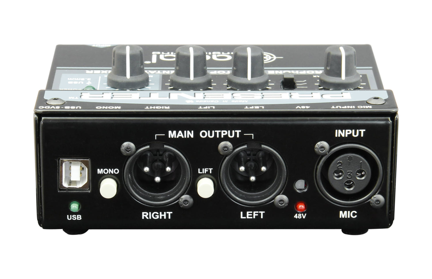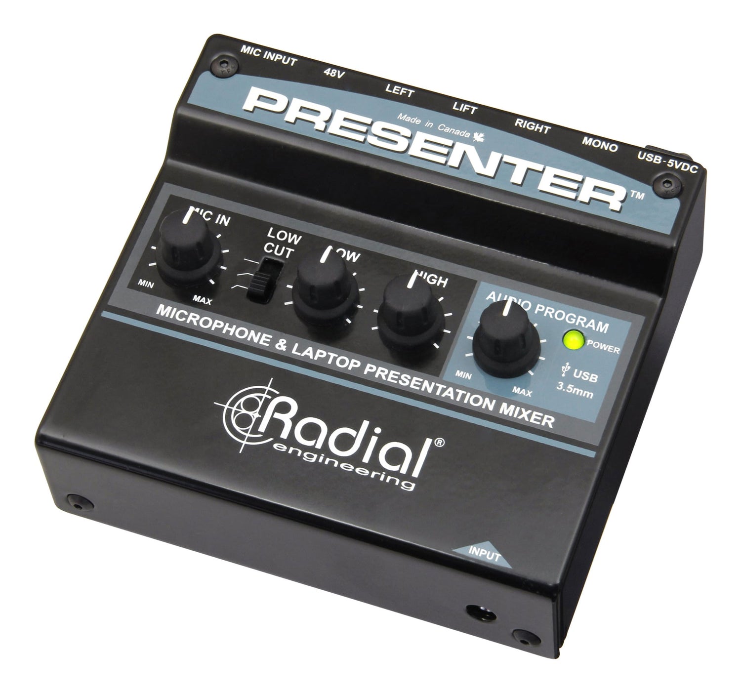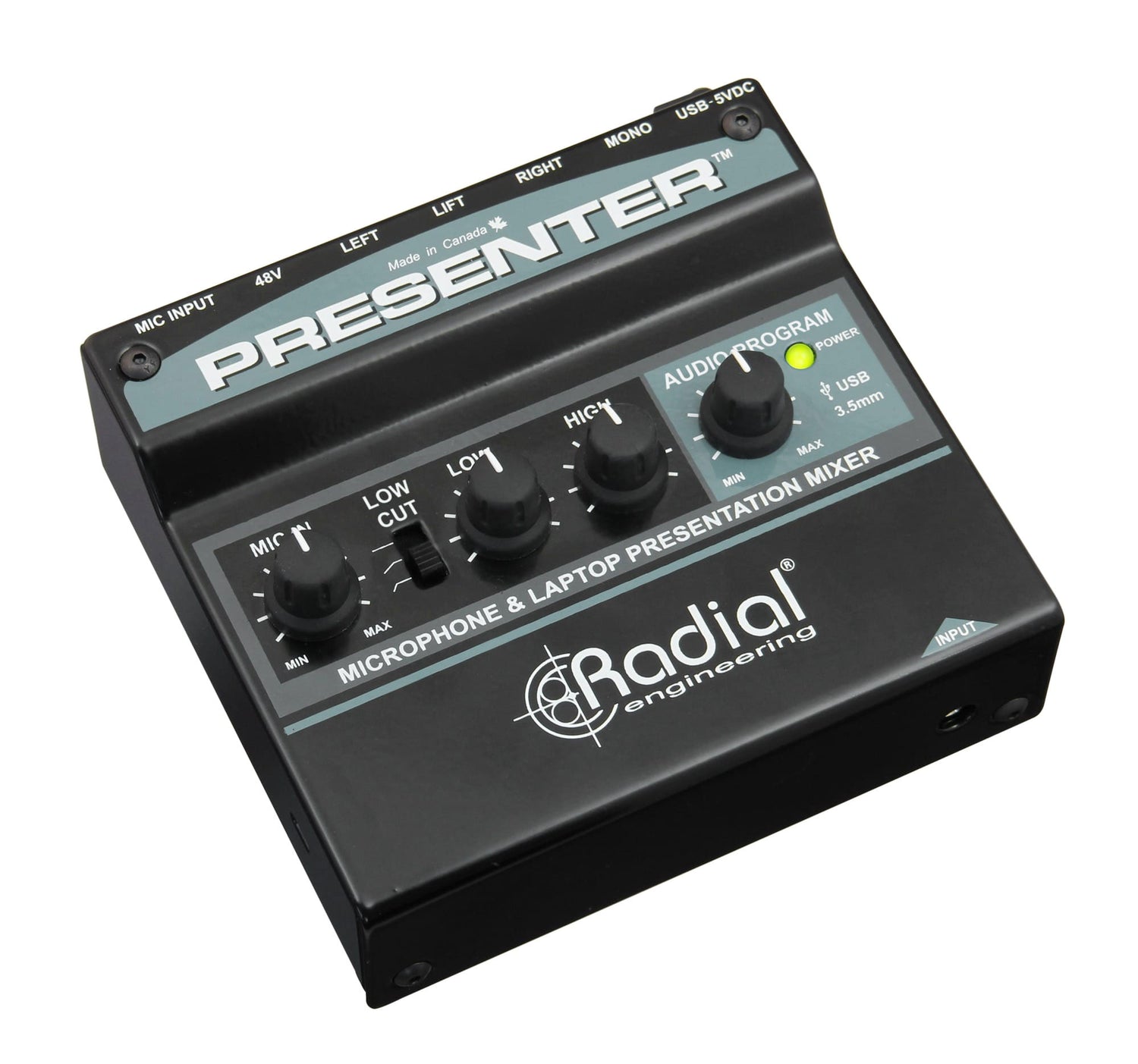 The Radial Presenter is a compact and intuitive presentation mixer that combines a professional mic preamp with USB and 3.5mm inputs, making it an ideal all-in-one audio solution for lectures, conferences, weddings, and podcasts. Designed for ease of use, it lets you blend microphone and playback audio seamlessly, without the complexity of traditional mixers.