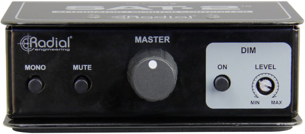 When using the SAT-2 as a monitor controller, simply connect it in between your playback device or recording interface and a pair of powered speakers. The SAT-2 is equally useful in a recording studio or with a simple PA rig to control the overall output levels. Both XLR and ΒΌ" TRS options are provided for the inputs of the SAT-2, eliminating the need for adapter cables. XLR outputs connect to your speakers, while the trim knob provides an easy-access master volume control. Mute and mono switches allow you to silence the outputs or sum left and right together to check mixes for mono phase compatibility. A handy dim switch with adjustable level control allows you to temporarily lower the output volume without losing the setting on the main trim control.