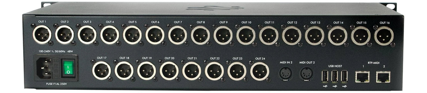 The PlayAUDIO2U by iConnectivity is a USB Audio + MIDI interface designed for reliable playback switching between two computers in live performance environments. It offers dual USB-C DAW ports, 24 balanced XLR analog outputs, and integrated MIDI connectivity through both DIN ports and Ethernet RTP-MIDI. The device fits into a standard 19" rack and supports up to 24-bit/96kHz audio conversion, making it suitable for high-quality audio routing in real-time.