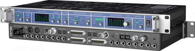 Features The 1 U height device offers an outstanding AD/DA conversion from/to AES/EBU and ADAT (MADI optional), at up to 192 kHz. The balanced inputs and outputs use RMEs circuit design, therefore guarantee outstanding noise and distortion values. Four different input and output levels each are available, offering a perfect adaptation to the analog domain. The latest generation AD/DA converters provide samplerates up to 192 kHz with a SNR of 120 dBA.