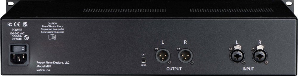 Drive and Control Levels with I/O Amplifiers To maintain optimal gain staging through the MBT, fully drive the interstage transformers, and accurately match the pre / post signals, the MBT includes Class-A input and output amplifiers to manage all levels. The output amplifiers feed Rupert Neve Designs' custom output transformers for line balancing and isolation.