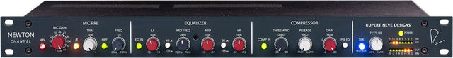 The Compressor The Newton Channel also contains the latest iteration of Rupert Neve Designs' ultra-smooth VCA compressor, with +20dB of make-up gain and ample control for any amount of needed compression while maintaining an effortless sound. Also included is a helpful ‘pre EQ/post EQ' push button to place the compressor either before or after the EQ section, plus an independent bypass button.