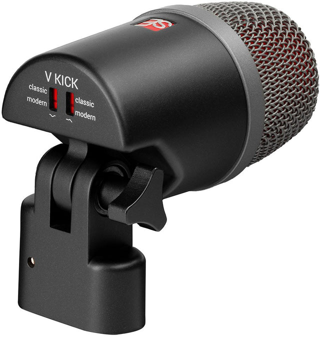 From big band to metalcore, the V KICK has got you covered. The V KICK is the most compact and versatile drum microphone in its class, intended for use with kick (bass) drums and other sources such as miking bass guitar speaker cabinets, floor toms or other large drums where low-frequency energy is of the utmost importance. Its integrated swivel joint allows for any required mic placement, and its specialized capsule provides a sound character tailored specifically for kick drums, which can be further shaped with the use of two switches on the rear side of the microphone. From warm and classic to modern and aggressive, the V KICK gives you any kick drum sound you need.
