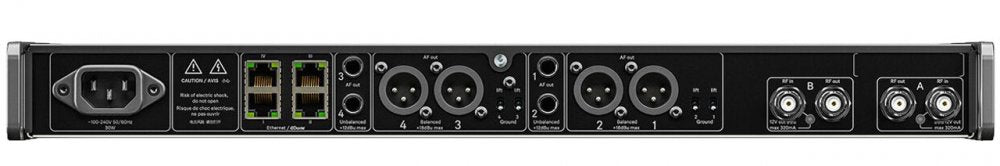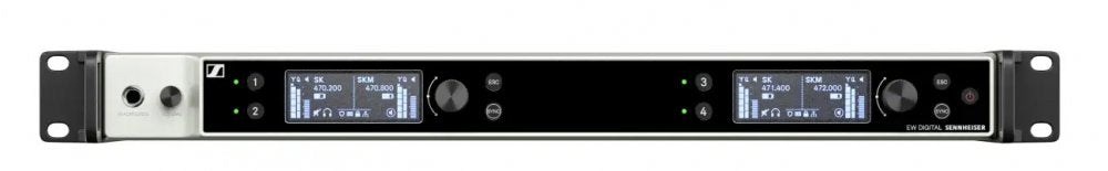 Four-channel digital full-rack (19") receiver with internal PSU and Dante for use with Evolution Wireless Digital handheld, bodypack and tablestand transmitters. Extended 88 MHz switching bandwidth, intermodulation-free operation [intermodulation-free equidistant channel spacing] for up to 293 channels with secure AES 256 encryption and four modular network ports.