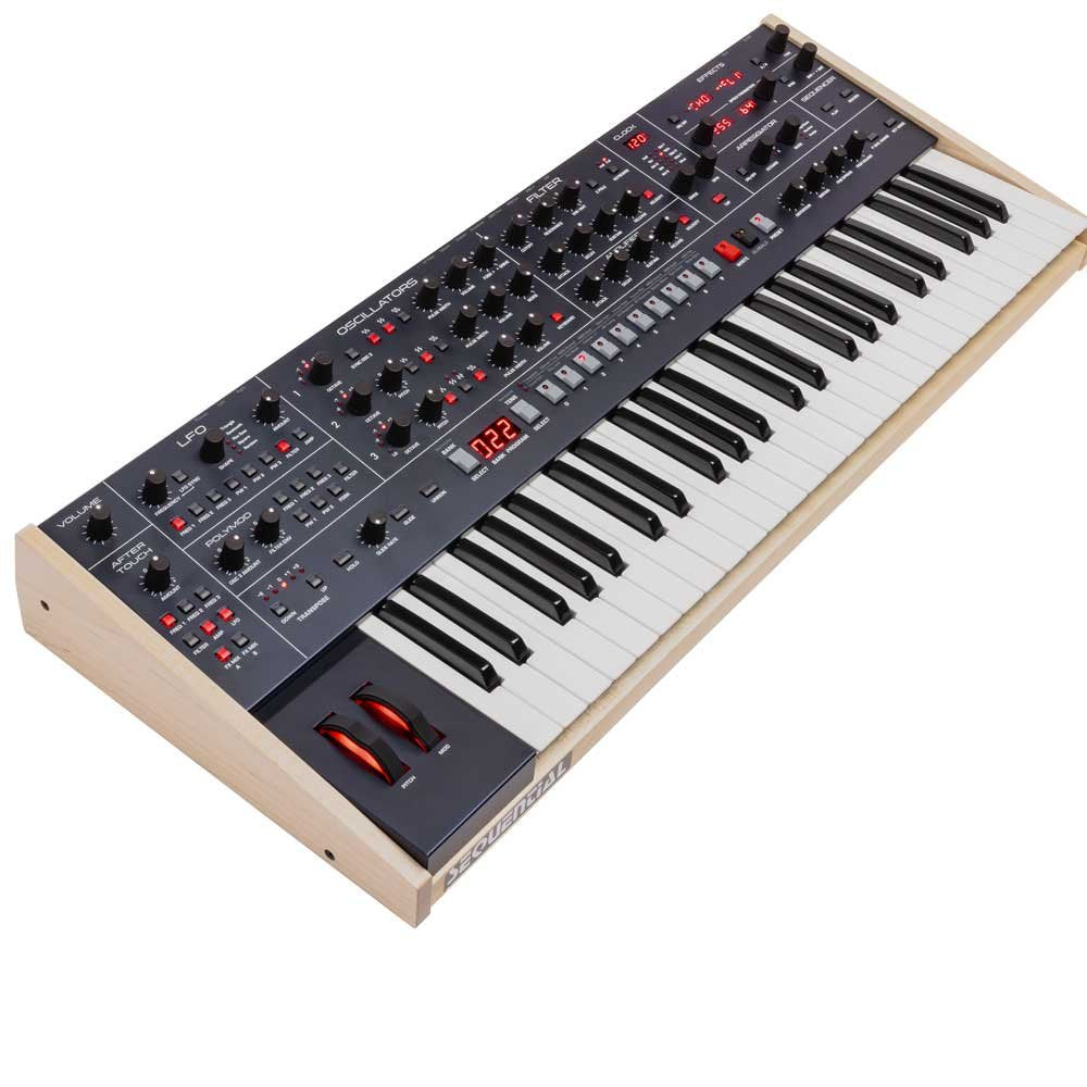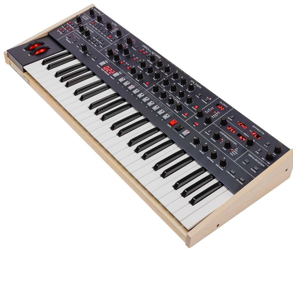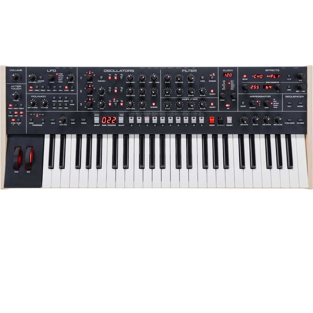 49-key, 6-voice polyphonic analog synthesizer with per-voice triple VCOs, 2/4-pole Resonant Lowpass Ladder Filters, Arpeggiator, 64-step Sequencer, Aftertouch
