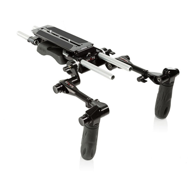 • Telescopic SHAPE black handle Arri rosette (HAND12SHADOW) Left and right telescopic handgrips with ARRI rosettes that can be attached to cameras or camera support hardware that has standard ARRI rosettes, which allow you to lock your arms in place. Each arm features four points of articulation (2 Push-button and 2 ratchet knob) to adjust the arms position. The ratchet knob along the arms allows you to extend the arms up to 2 inches and rotate the handgrips throughout 360. The one near the rosette gives you more option to position the arm for your comfort.