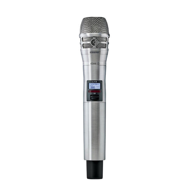 The Shure ULXD2/K8B is a digital handheld transmitter for ULX-D systems, featuring the KSM8 dual-diaphragm dynamic capsule for exceptional vocal clarity and consistent tone with minimal proximity effect. Its cardioid pattern offers focused pickup and feedback rejection, ideal for live vocal performances.