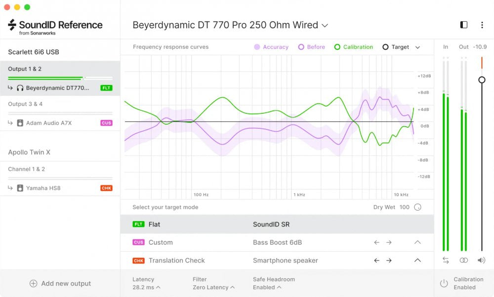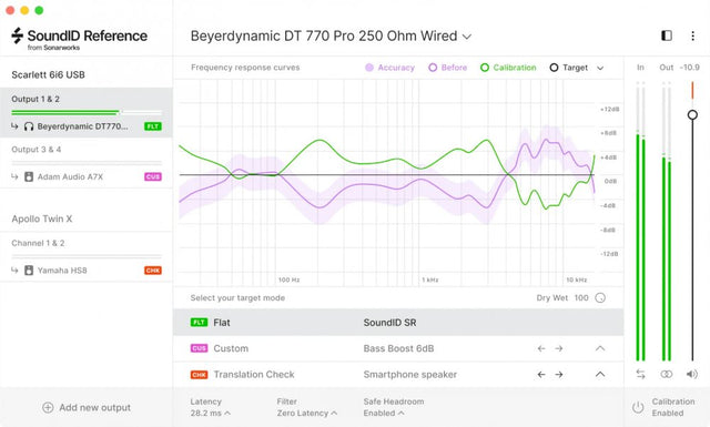 SoundID Reference For Headphones is headphone calibration software delivering consistently accurate studio reference sound on your existing headphones. The software includes presets of more than 280 headphone calibration profiles. With an applied headphone calibration profile the software sets the frequency response target to be completely flat across all audible frequencies. The headphone frequency response target is designed to emulate neutral-sounding speakers. With calibrated headphones, you'll hear a flat, consistent sound wherever you go.