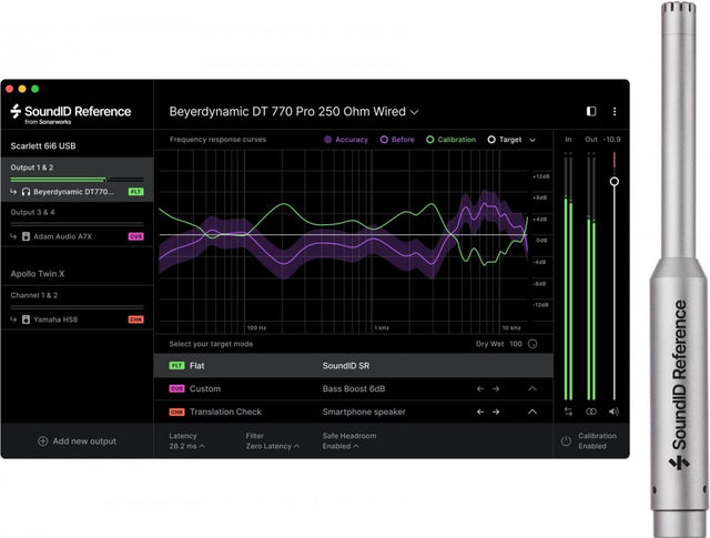 In less than 20 minutes you can calibrate your existing studio speakers with a SoundID Reference measurement microphone and calibrate your existing headphones with more than 280 headphone calibration profiles already included in the software as ready-to-use presets. With an applied calibration profile the software sets the frequency response target to be completely flat across all audible frequencies so you can make music that sounds great everywhere. You can also now make custom adjustments to the target curve in real time with the new custom target feature.