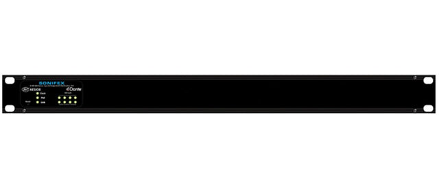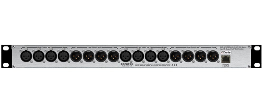 The Sonifex AVN-AESIO8 is a 1U rack-mount audio converter and interface that facilitates the integration of traditional digital audio equipment with modern Dante Audio-over-IP networks. It provides eight balanced stereo AES3 inputs and eight balanced stereo AES3 outputs, all on high-quality Neutrik XLR connectors.
