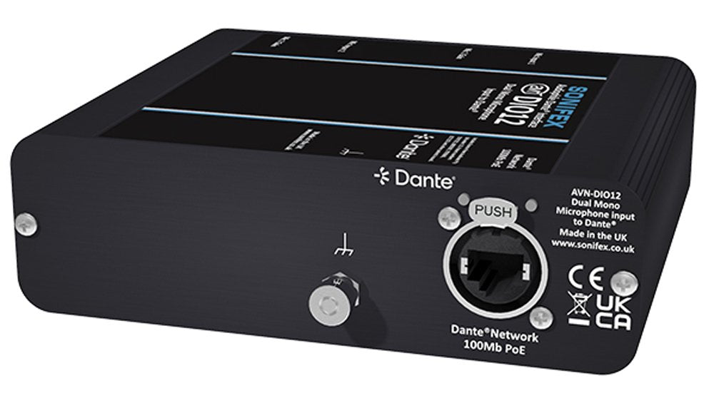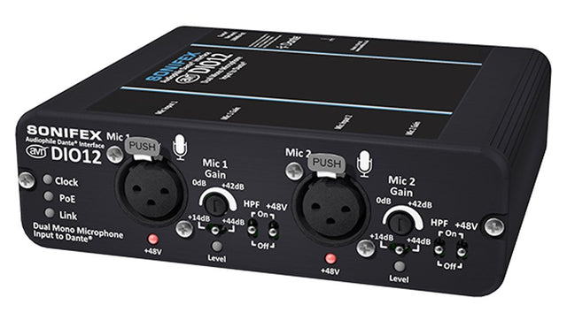 The Sonifex AVN-DIO12 is a dual microphone input to Dante converter, designed to integrate two balanced analog XLR microphone inputs directly into a Dante Audio-over-IP network. Each input offers adjustable coarse and fine gain controls, allowing for precise amplification settings tailored to various microphone sensitivities. A high-pass filter can be engaged to attenuate frequencies below 125Hz, effectively reducing unwanted low-frequency noise. For condenser microphones, 48V phantom power is available and can be activated individually for each input. Tri-color LED indicators provide real-time visual feedback on audio levels, assisting in optimal gain staging. The unit connects to the network via a Neutrik etherCON connector and is powered through Power over Ethernet (PoE), streamlining installation by combining data and power delivery. Compliant with AES67 and Dante Domain Manager, the AVN-DIO12 ensures compatibility and secure management within diverse Dante network environments.