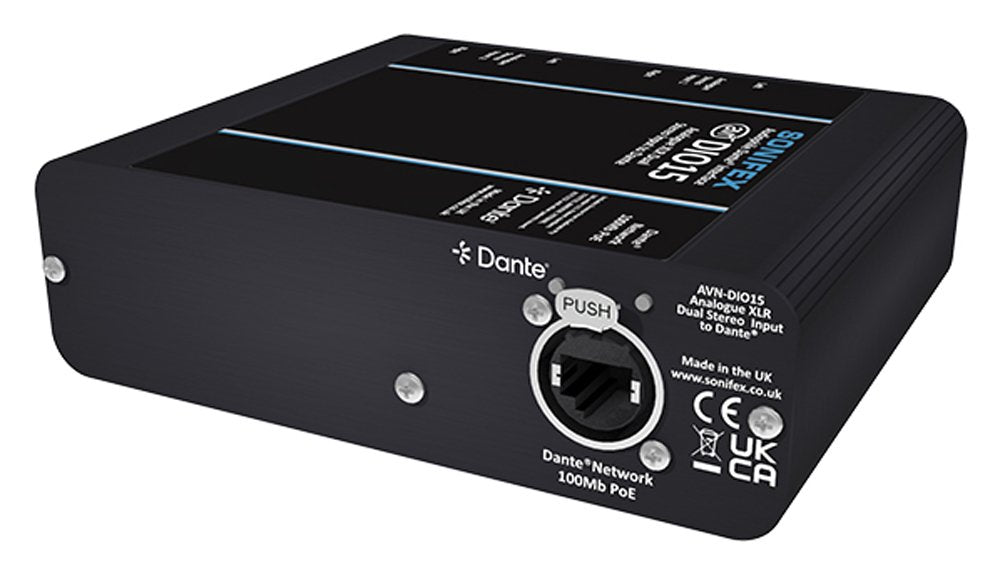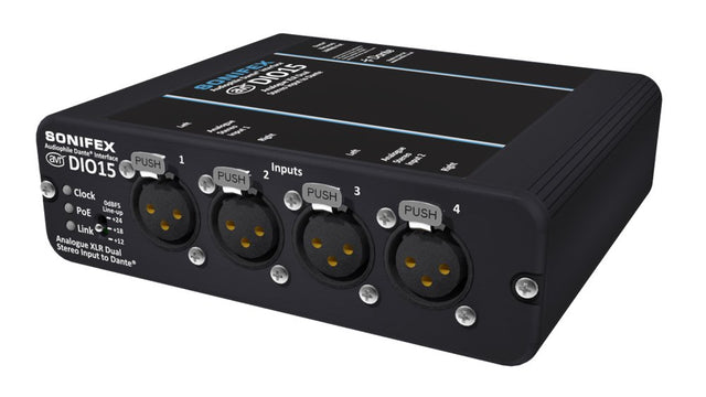 The Sonifex AVN-DIO15 is a compact audio interface designed to integrate up to four balanced analog XLR inputs into a Dante Audio-over-IP (AoIP) network. Each input utilizes high-quality Neutrik XLR connectors, ensuring reliable and professional-grade connections. The device connects to the Dante network via a Neutrik etherCON connector, providing a robust and secure network interface.