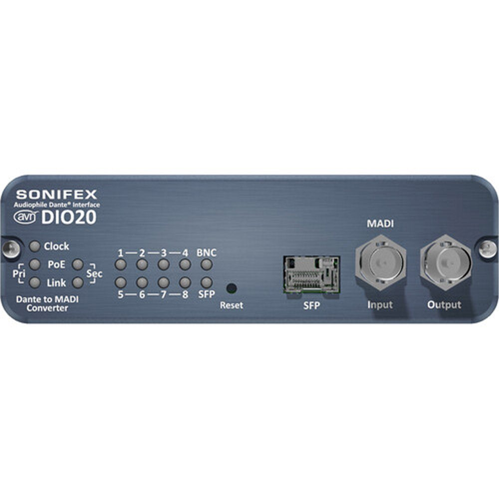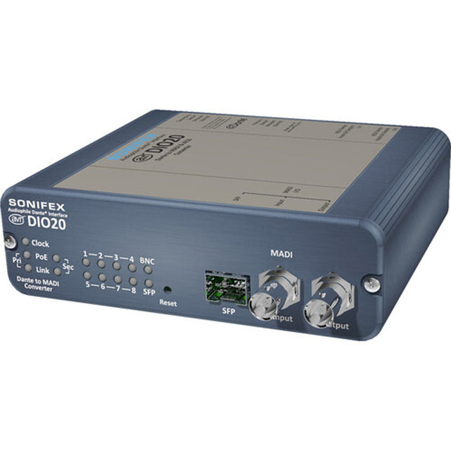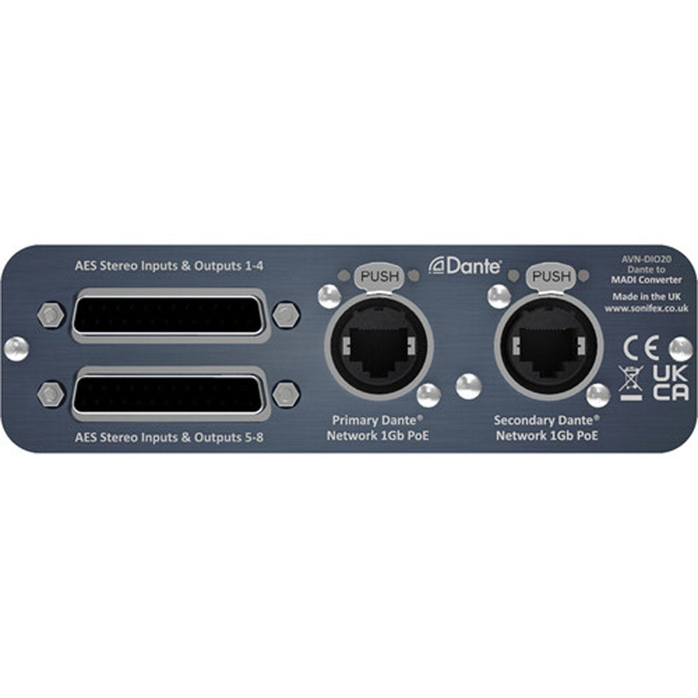The Sonifex AVN-DIO20 is a versatile bridging device that facilitates bidirectional connectivity between MADI (AES10) and Dante Audio-over-IP (AoIP) networks, along with eight stereo channels of AES3. This plug-and-play interface enables seamless integration of legacy MADI equipment into modern Dante AoIP systems.
