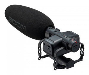 Shotgun microphone with 32-bit recorder, windscreen, shockmount, and stereo mini-cable for DSLR connection