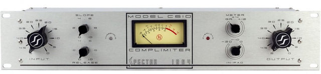 The Spectra 1964 Model C610 Complimiter. True to the original, the C610 still utilized the unchanged and still unmatched 601 Compressor/Limiter circuit, as well as a 101 amplifier for make-up gain. The improvements we've made include XLR and Phoenix I/O, highest quality input/output transformers, selectable input padding, buffered true VU metering, and multi-stage overload indication.