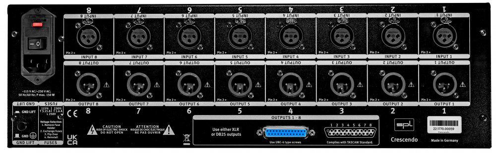 Crescendo 8 is an eight-channel microphone preamplifier with 120V technology. All eight channels feature the same range of functions. Besides phantom power (48 V) for condenser microphones, polarity reversal and a PAD switch, they provide the possibility to adjust the VU meter to display very high levels. The gain can be adjusted comfortably and precisely via a high-quality potentiometer. Two outputs per channel allow the signal to be sent to two different devices in parallel. In addition to the extensive feature set and the outstanding technical characteristics, Crescendo 8 convinces with a sonic authenticity that is second to none.