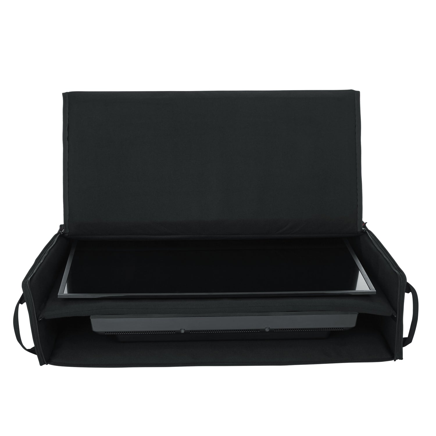Dual LCD tote for 40–45″ screens, padded divider, 25 mm PE foam, shatter-resistant shield, soft tricot lining, zip closure, storage pocket, handles, and strap