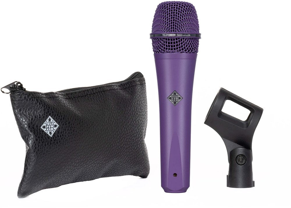 Supercardioid Dynamic handheld vocal microphone. Purple body and purple grille. Comes with microphone clip and leather carrying case