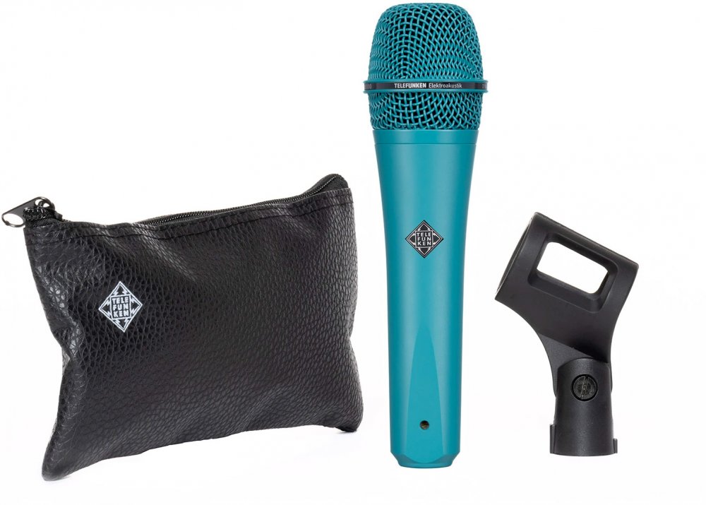 Supercardioid Dynamic handheld vocal microphone. Turquoise body and turquoise grille. Comes with microphone clip and leather carrying case