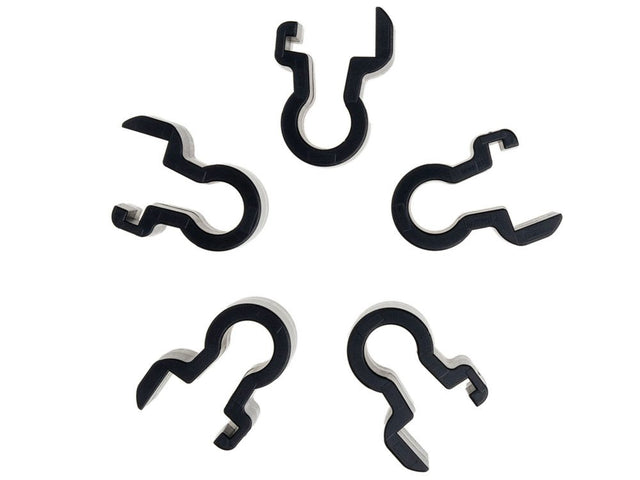 A pack of five locking clamps designed for the SYNC E timecode generator. Easily secure angled cables with the clamp's smooth sliding mechanism for a reliable hold. Just slide clamp over cable connector along recess of SYNC E until it locks.