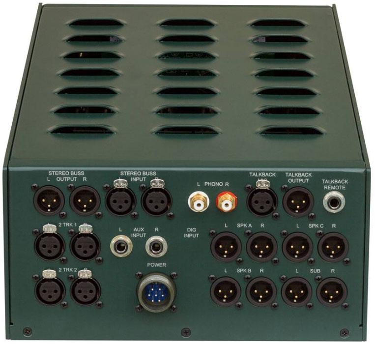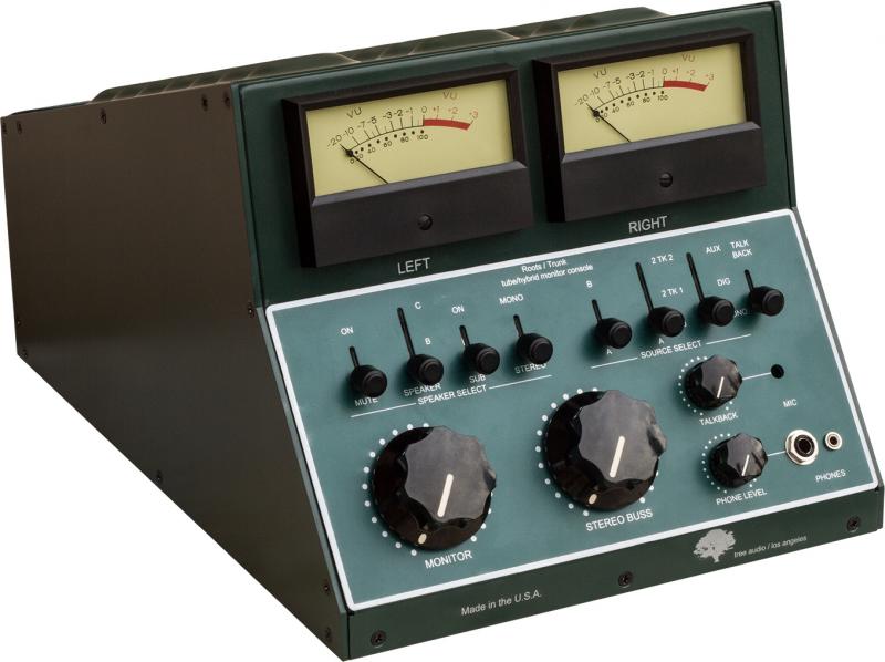 The Tree Audio The Trunk offers a choice of three monitor inputs with a sub input, talkback with mic XLR in, mono sum. Additional inputs include RCA phono, aux inputs and Digital. Source selection includes Stereo Buss,2 Track 1 and 2 Track 2. Two big VU metres are included to display output level.