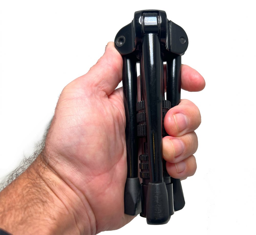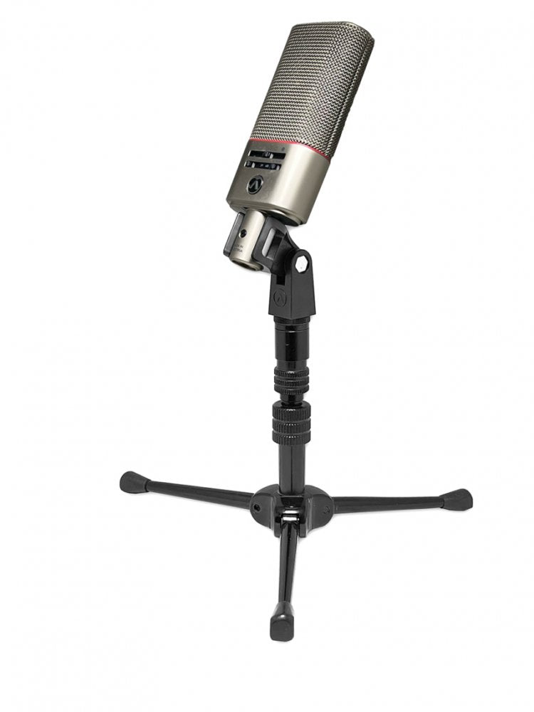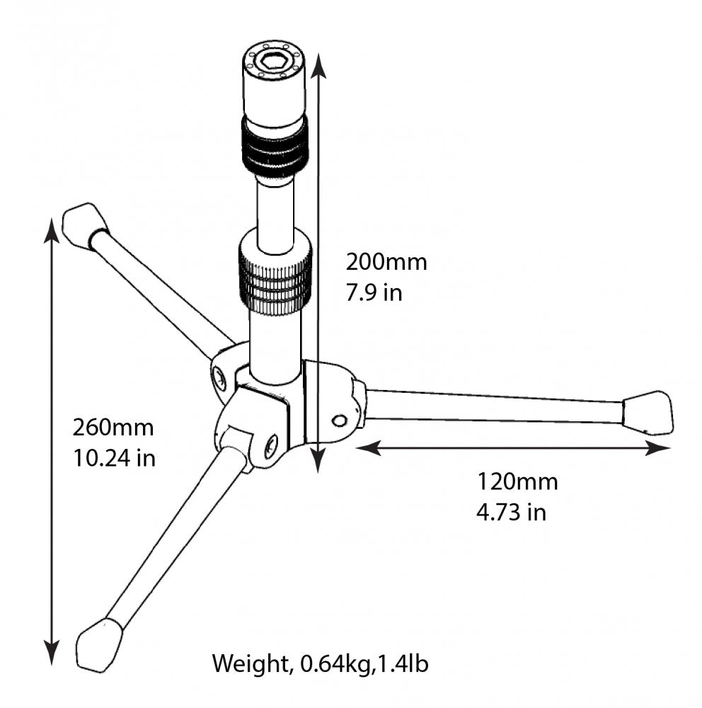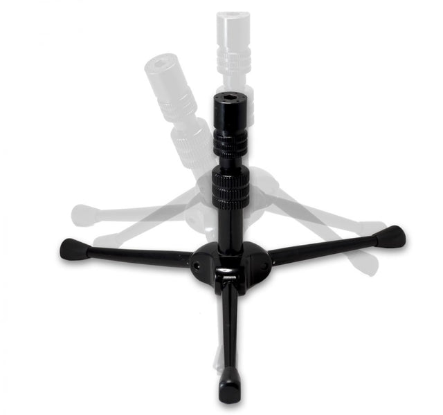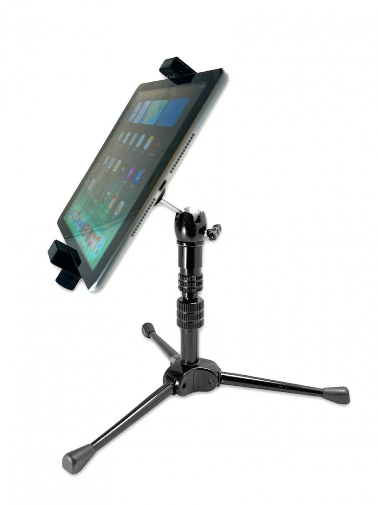 Triad Desk Stand small portable desk stand with iO connectivity. TDS has a small footprint (10.25″) with a surprisingly low center of gravity, and weighs in at 1.4 lbs. With a max height of 7.9″ it is perfect for placing devices on a desk, table, or console. TDS has adjustable legs to allow maneuverability wherever it is placed, and folds upon itself, creating a compact travel companion. Place anything from small monitors to large tablets or heavy large diaphragm condenser mics quickly without concern of tipping. Shown with iOrbit (sold separately).
