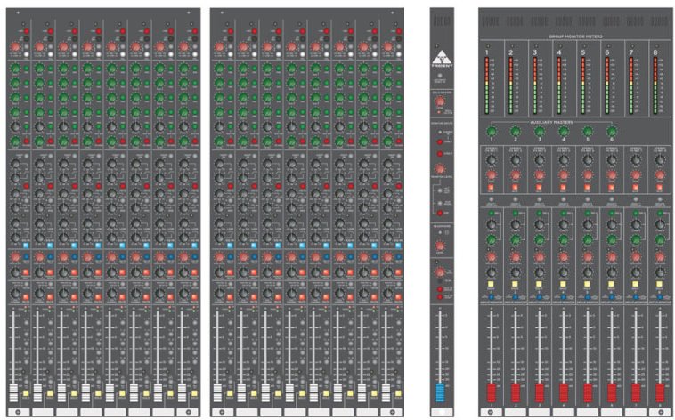 The master section features 6 AUX Masters each with Solo. AFL/PFL Master with level adjustment. In addition to the main speaker outputs there is also a separate ALT Monitor, each with level control, DIM, and on/off switches. The Monitor section allows the return of 2 separate stereo signals direct into the master section with level and mute. Or plug your portable device directly into the panel with a top mounted 1/8th inch TRS input. Through Talkback control you can talkback to the Auxes or the groups. Using either the onboard talkback mic or an external mic.