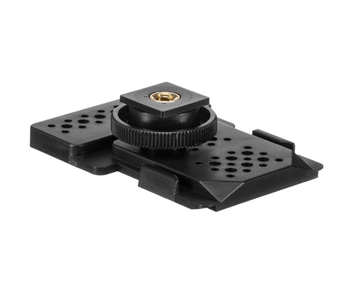 Shoe mount adapter for EW series receivers, secures to camera accessory shoe, compact design, ideal for on-camera wireless audio setups.