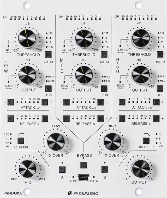 Key features include a purely analog design with 24dBu headroom, customizable crossover filters, and independent VCA compressors for each band, enhancing versatility across low, mid, and high frequencies. The unit also includes a MIX knob for parallel compression, band-specific bypass and solo options, and comprehensive metering. Additionally, Pandora's DAW plugin enables complete control over hardware parameters directly from the digital interface, making it an essential, user-friendly solution for both detailed sound control and effortless recall.