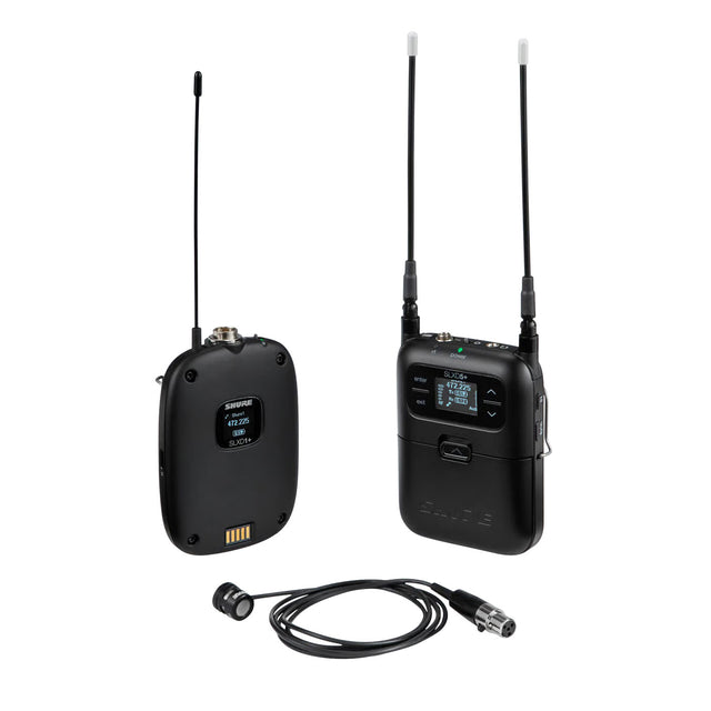 Paired with it is the SLXD1+ digital bodypack transmitter, which delivers 24-bit / 48 kHz audio, 118 dB dynamic range, and long-lasting power via AA batteries or the optional SB903 rechargeable battery. It connects to the included WL185M low-profile lavalier microphone, a cardioid condenser mic optimized for clear, isolated vocal pickup which is ideal for interviews or dialogue in uncontrolled environments.