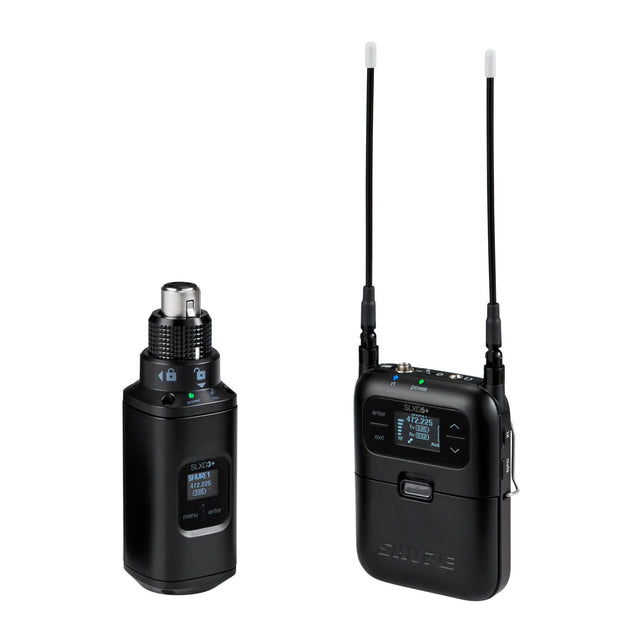 The system includes the innovative SLXD3+ plug-on transmitter, which features a patented wobble-free locking ring, switchable 12V/48V phantom power, and external USB-C charging which makes it suitable for use with both dynamic and condenser microphones. It also supports 24-bit / 48 kHz digital audio, 118 dB dynamic range, high-pass filtering, and Bluetooth firmware updates. Power is provided via 2 AA batteries or the optional SB903 rechargeable battery, with up to 8 hours of runtime.