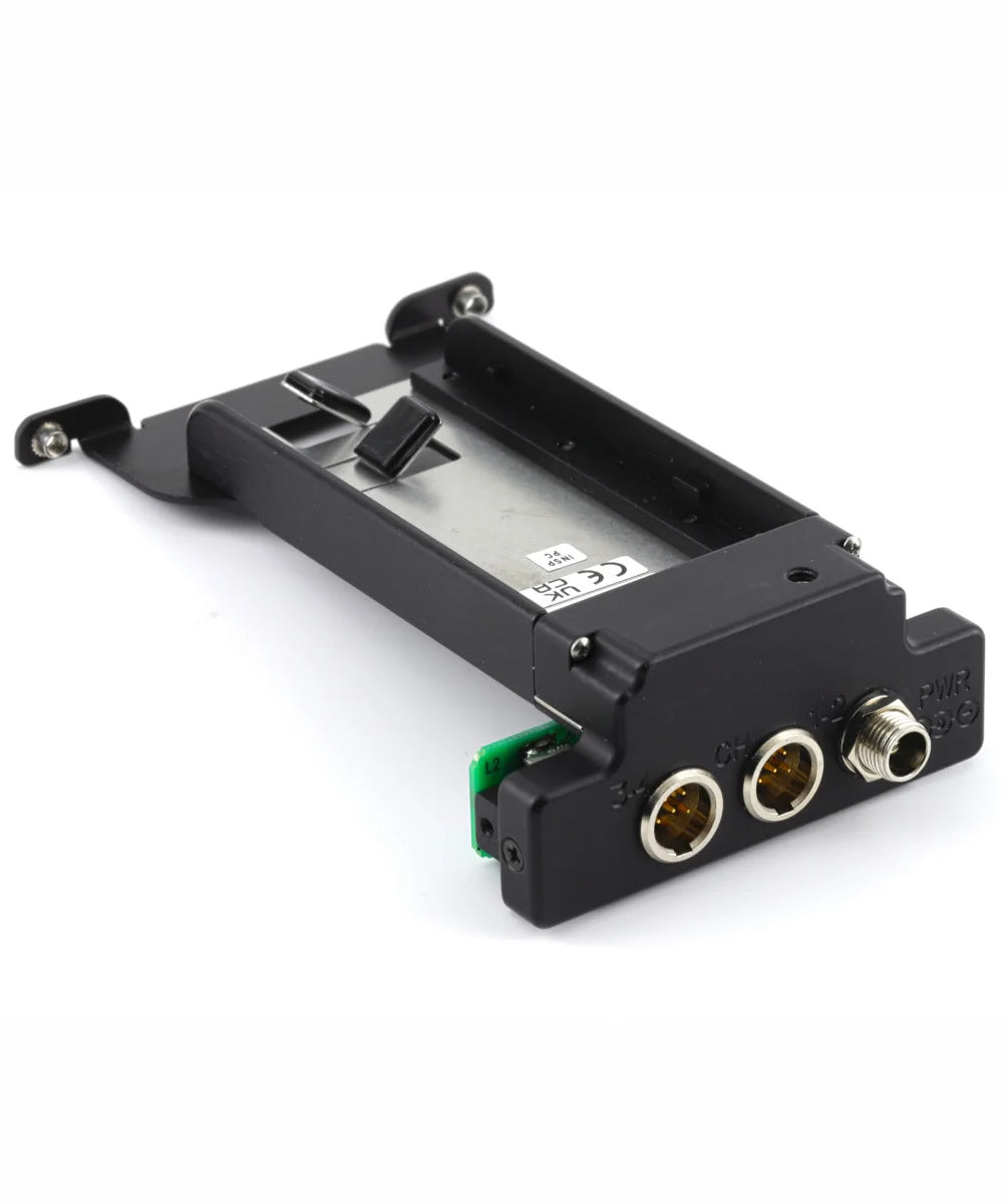 The Lectrosonics Battery Sled Top Plate Kit (DSR4BATTSLEDTOP) for DSR4 receivers is an L-type battery sled kit for mounting on the top of cameras. This sled correctly orients LCD and rear panel nomenclature.